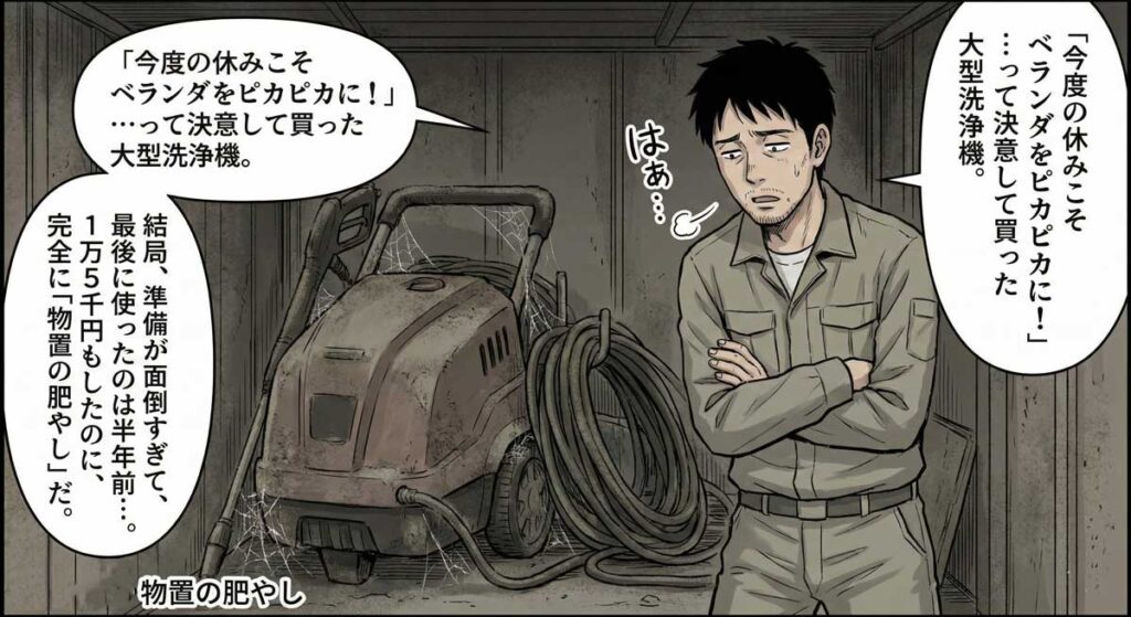 3ヶ月後。物置の奥で埃をかぶる高圧洗浄機を見るたびに、後悔の念が押し寄せる。15,000円もしたのに、使ったのはたった2回。準備が面倒すぎて、結局「物置の肥やし」と化している。
