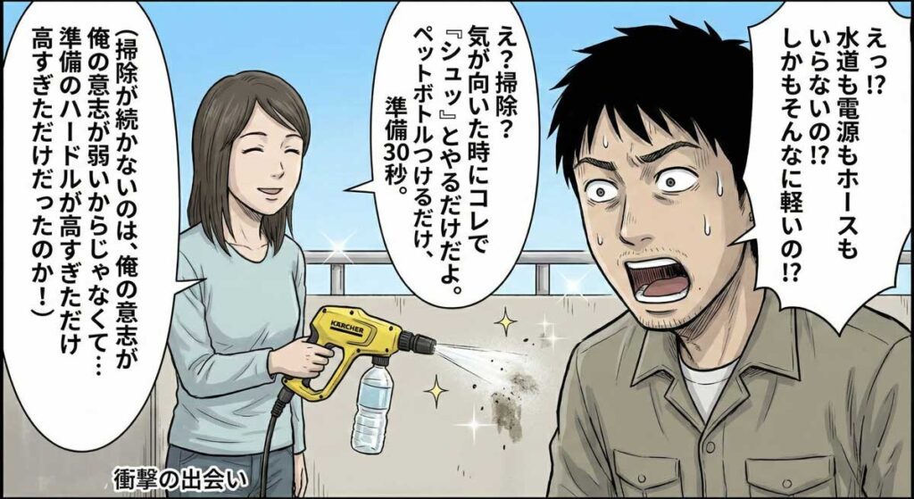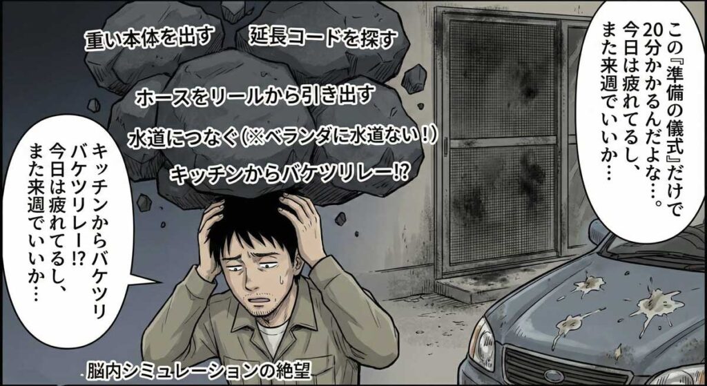 昨年、意を決して購入した大型高圧洗浄機。確かにパワーはすごい。でも、延長コードをリールから引き出し、水道ホースを接続し、電源を探す。この「儀式」だけで20分が消えていく。やっと準備が整った頃には、汗だくで息が上がっていた。