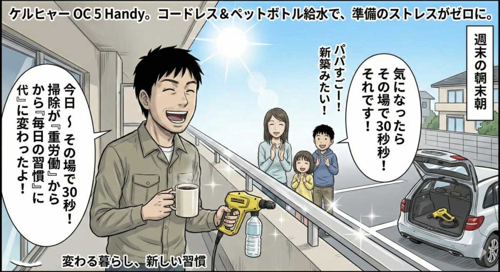 5分後、手すりはピカピカだ。機械をサッと拭いて、玄関に戻す。重いホースを巻く必要も、水を抜く必要もない。掃除が「イベント」から「習慣」に変わる瞬間を、あなたは体感する。