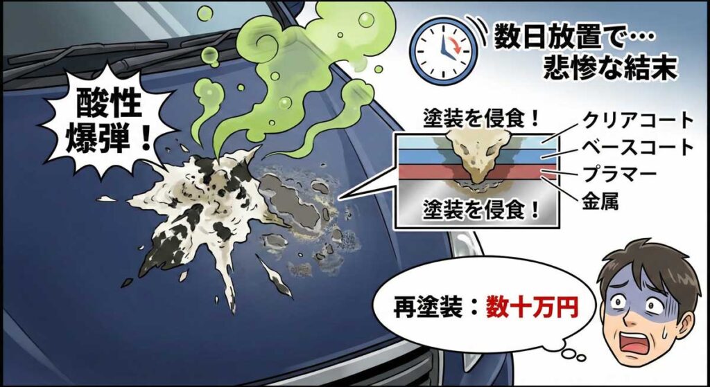 知っていましたか? 鳥のフンは「酸性の爆弾」です。たった数日放置しただけで、クリア塗装を侵食し、最悪の場合、再塗装で数万円から十数万円の修理費が飛んでいきます。板金塗装の見積もりを見て愕然とする前に、30秒で防げたはずの出費です。